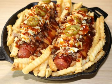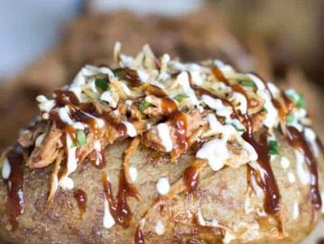 A gargantuan, one pound baked potato stuffed with Pulled Pork or Chicken, butter, cheese, and chives with sour cream and our homemade BBQ sauce on the side.